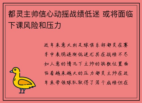 近年来,意大利足球俱乐部都灵在赛季中表现逐渐低迷,尤其在战绩不尽如人意的情况下,主帅的执教位置面临着越来越大的压力。都灵主帅在近年来带领球队取得了若干成绩,但在本赛季中,随着战绩的持续低迷和球迷及媒体对其表现的质疑,其未来似乎变得充满变数。本文将从多个角度深入分析都灵主帅信心动摇、战绩低迷以及面临下课风险的原因,具体从球队战绩不佳、战术体系失衡、球队士气低落和外部舆论压力四个方面进行探讨。通过这些分析,可以清楚地看出主帅面临的巨大挑战和可能的去留问题。